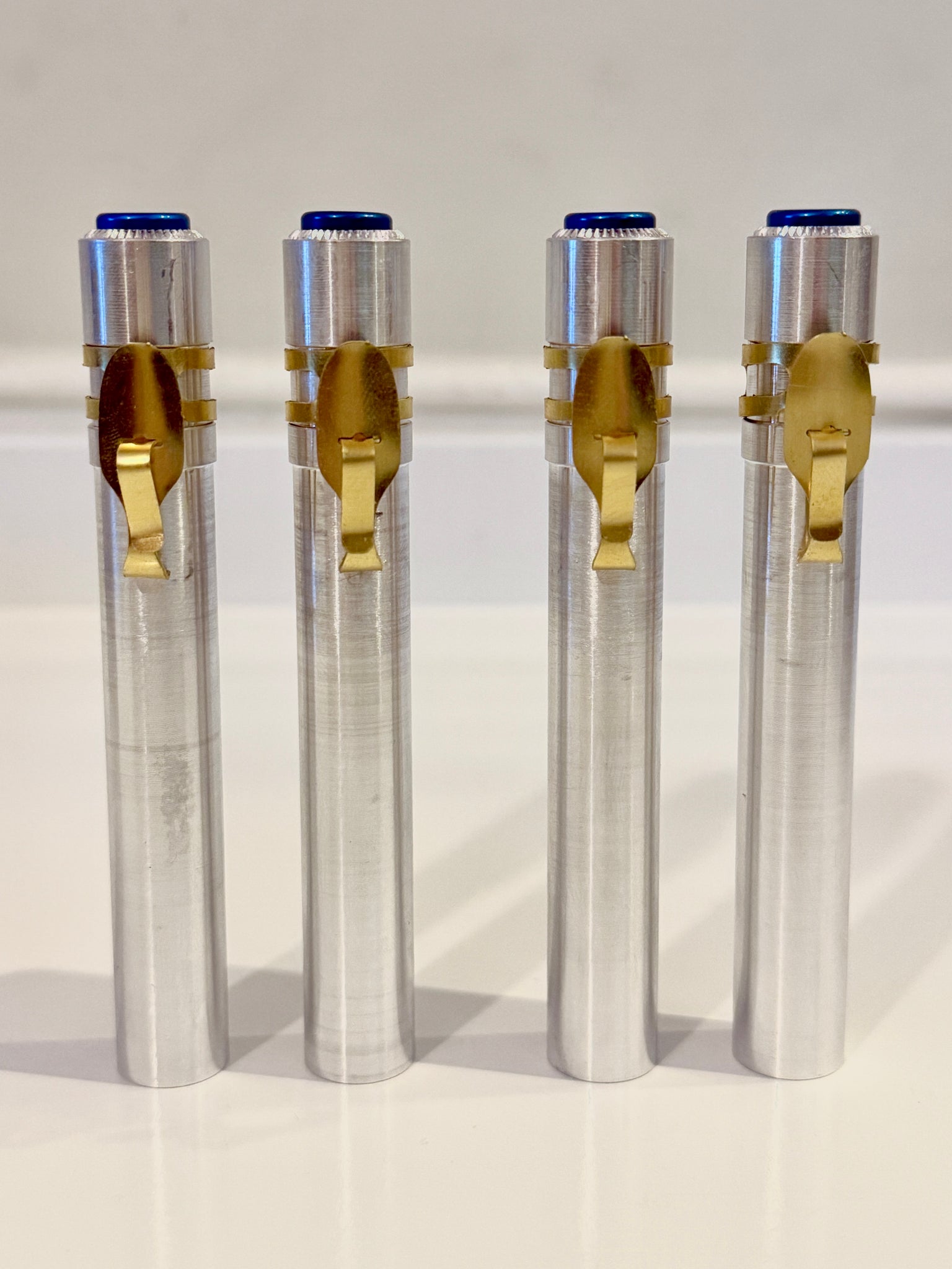 The cylinder is made to the same machined dimensions as the original dosimeters. They're affixed with an accurate blue cap, a reproduction end cap made of rubber, and a shaped metal clip in either brass or aluminum.